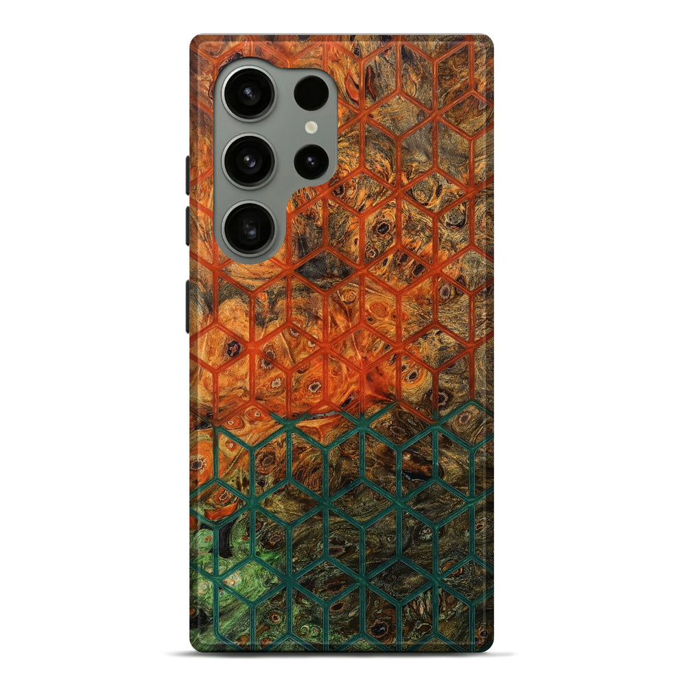Our Live Edge cases are made from an amazing combination of stabilized wood burl and colored resin. Our stabilization process hardens the wood to protect against cracks and breaks. We do every step of the process at our shop in Northern Indiana. Perfectly fits the Galaxy S24 Ultra.