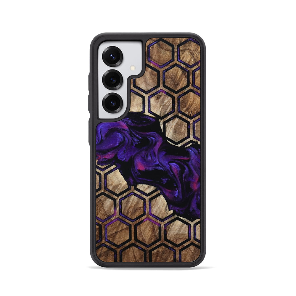 Ashtyn has a beautiful mix of warm maple wood tones and vivid purple swirls. Its hexagonal pattern adds a modern touch to the natural wood background.