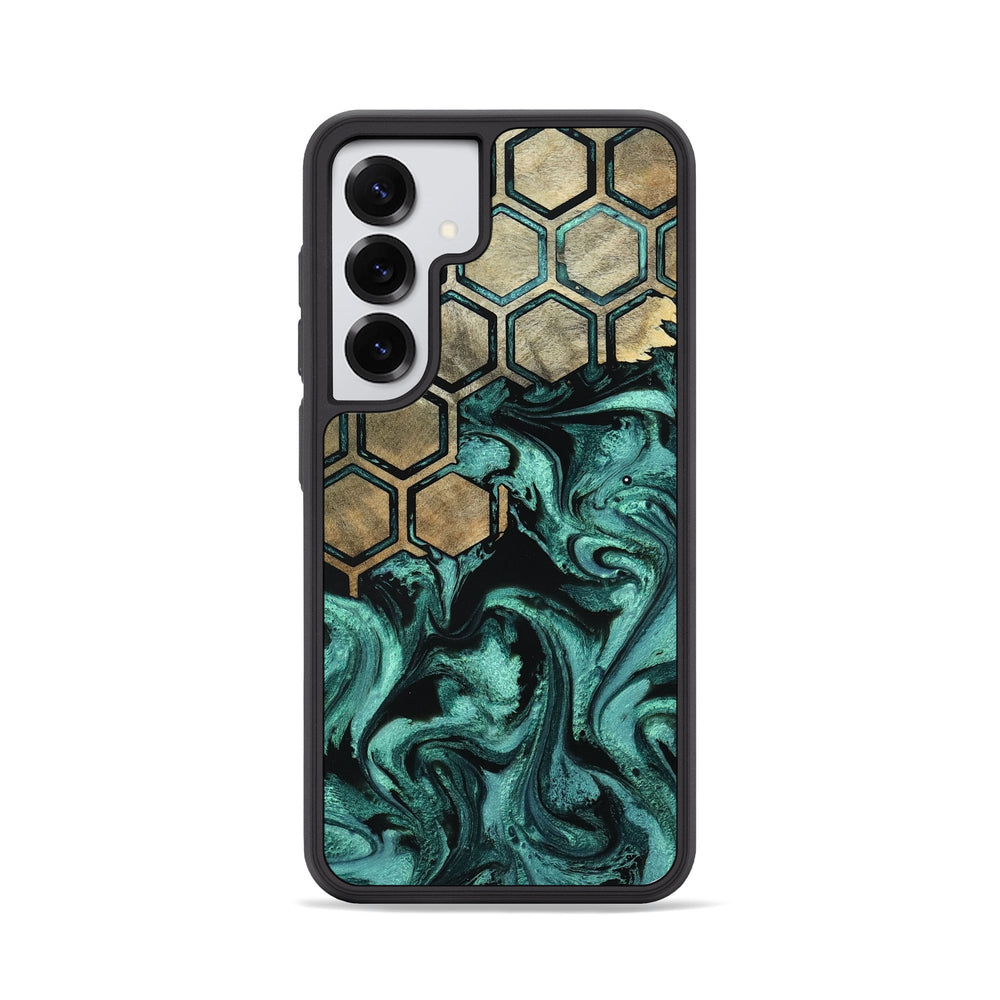 Zariyah features a mix of deep, swirling greens and blacks, creating a calming, fluid effect. It has a pattern of hexagons that adds a unique geometric touch to the natural wood design.