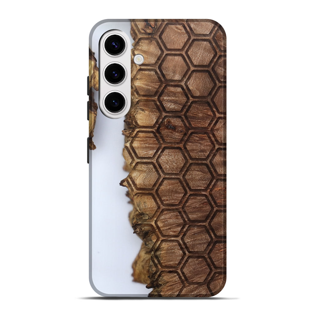Our Live Edge cases are made from an amazing combination of stabilized wood burl and colored resin. Our stabilization process hardens the wood to protect against cracks and breaks. We do every step of the process at our shop in Northern Indiana. Perfectly fits the Galaxy S25 Plus.