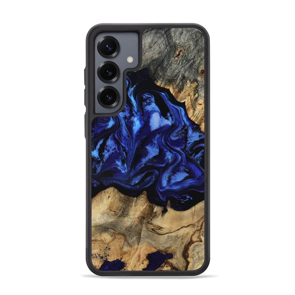 Tayler has beautiful swirling patterns in deep blues that evoke a sense of calm. The wood features a mix of light and dark grains, creating a striking contrast.