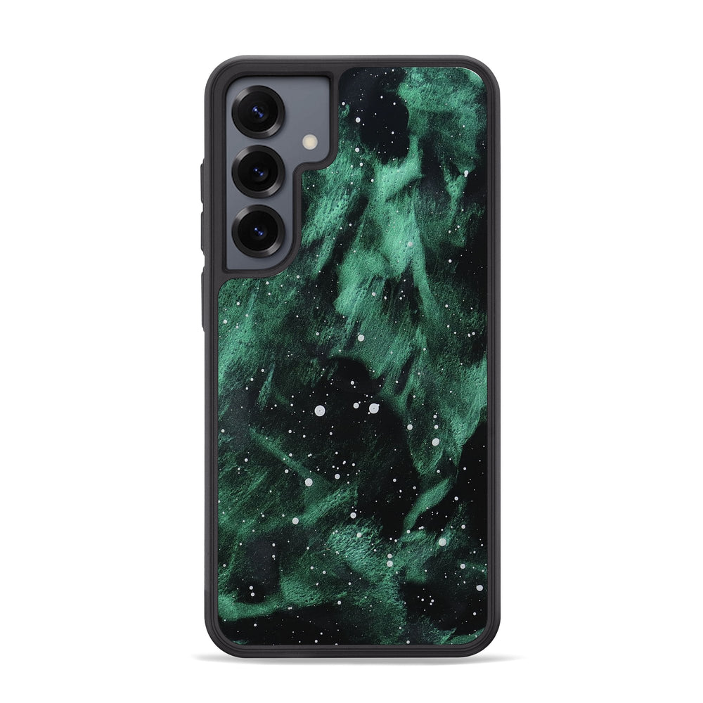 Elvera has a deep black background with soft swirls of green and white, creating a dreamy effect. The blend of colors gives it a calming, cosmic feel, reminiscent of a night sky.