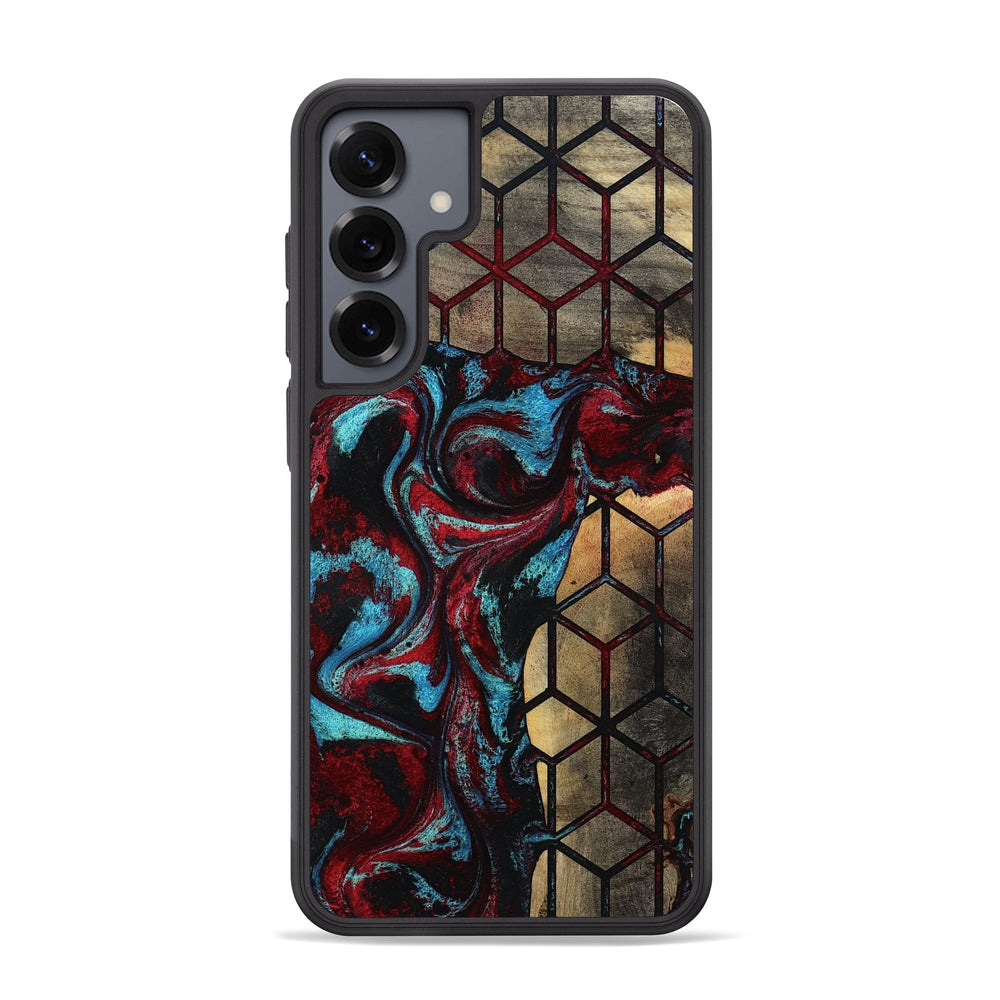 Casimer has a striking blend of deep reds and blues swirling against a backdrop of warm wood tones. The pattern of hexagons adds a playful touch, enhancing its unique visual appeal.