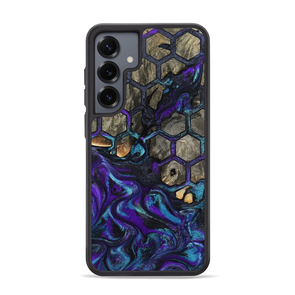 Ieshia has beautiful Buckeye wood with dark and light tones. Intertwined with vibrant swirls of purple and blue, it features a hexagonal pattern that adds depth and interest.
