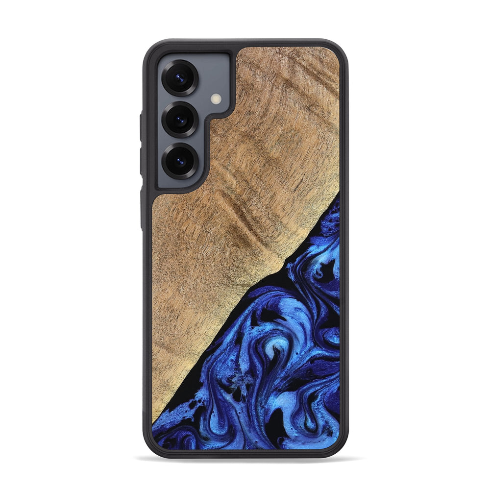 Jaylan has a warm, light maple wood finish that showcases its natural grain. It features bold swirls of deep blue, creating a striking contrast and a dynamic visual pattern.
