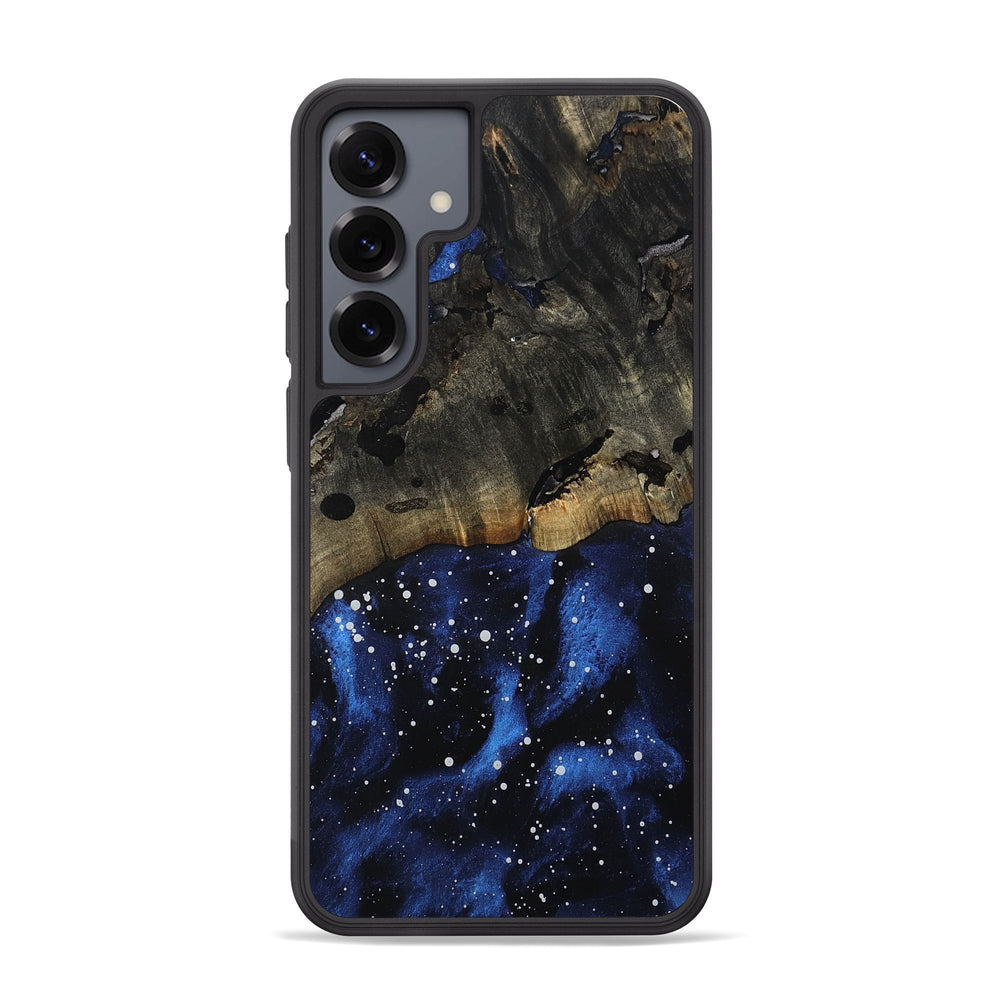 Luvenia has rich, detailed patterns in its dark wood that give it a unique character. The vibrant blue and white accents create a stunning contrast, resembling a starry night sky.