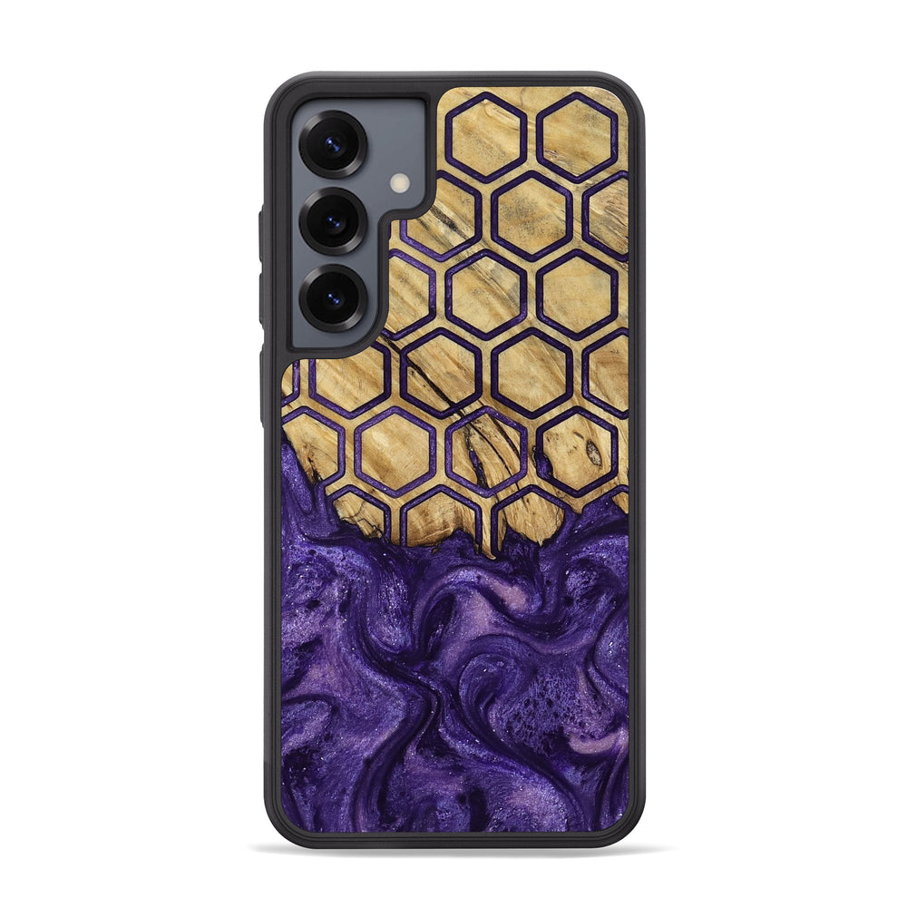 Regan has a unique pattern with honeycomb shapes arranged over a warm, golden wood background. The deep purple swirls at the bottom add a striking contrast, creating a balanced yet intriguing look.