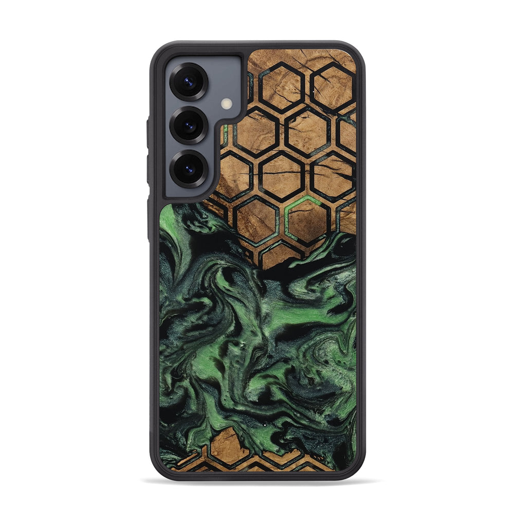 West has a rich Maple wood base featuring a warm, natural tone. It is beautifully paired with a striking hexagon pattern that contrasts with the smooth swirls of green and black.