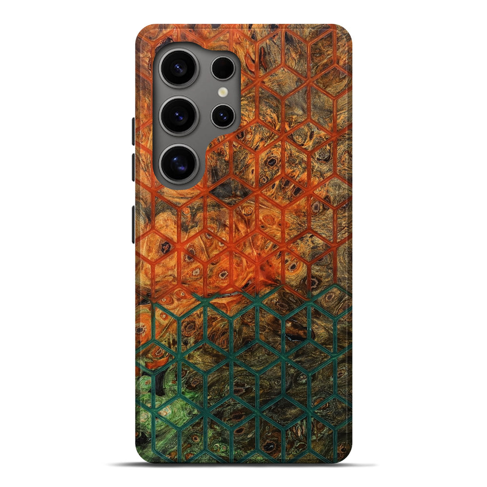 Our Live Edge cases are made from an amazing combination of stabilized wood burl and colored resin. Our stabilization process hardens the wood to protect against cracks and breaks. We do every step of the process at our shop in Northern Indiana. Perfectly fits the Galaxy S25 Ultra.