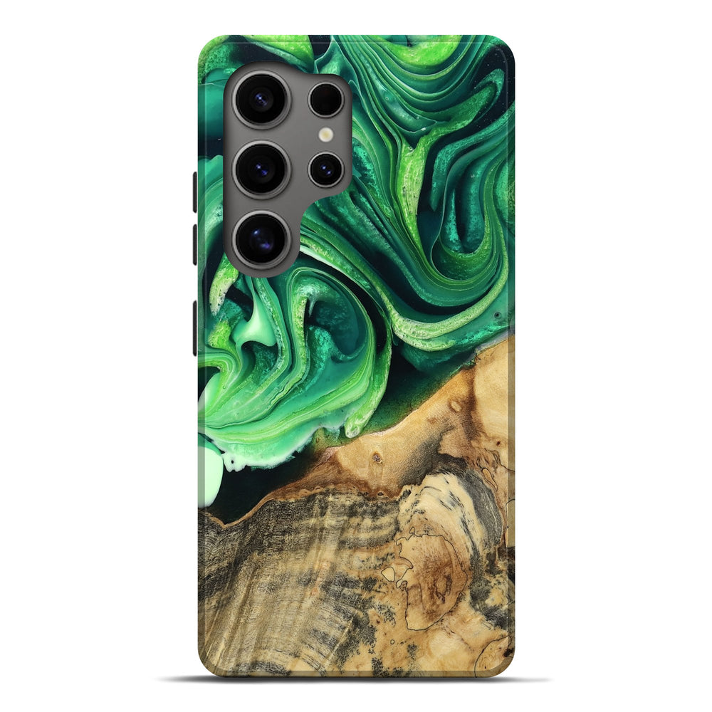 Our Live Edge cases are made from an amazing combination of stabilized wood burl and colored resin. Our stabilization process hardens the wood to protect against cracks and breaks. We do every step of the process at our shop in Northern Indiana. Perfectly fits the Galaxy S25 Ultra.