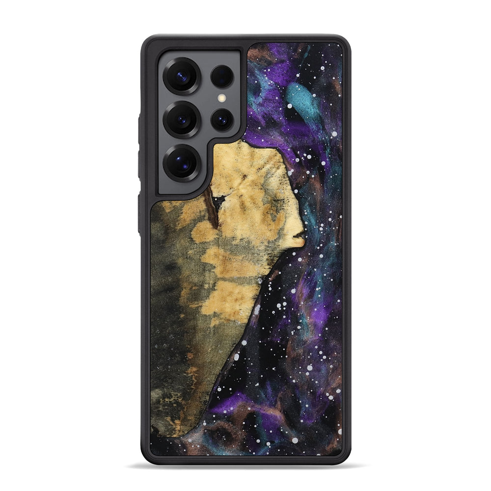 Callen has beautiful patterns that resemble swirling galaxies with deep purples and hints of blue. Its surface features natural wood grain that adds warmth and character, creating a striking contrast with the cosmic colors.