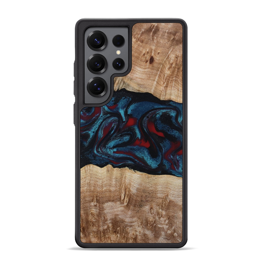 Rhea has a warm, natural Maple wood surface with soft swirls and a smooth finish. It features a striking contrast of deep blue and red patterns that create a lively flow across the wood grain.