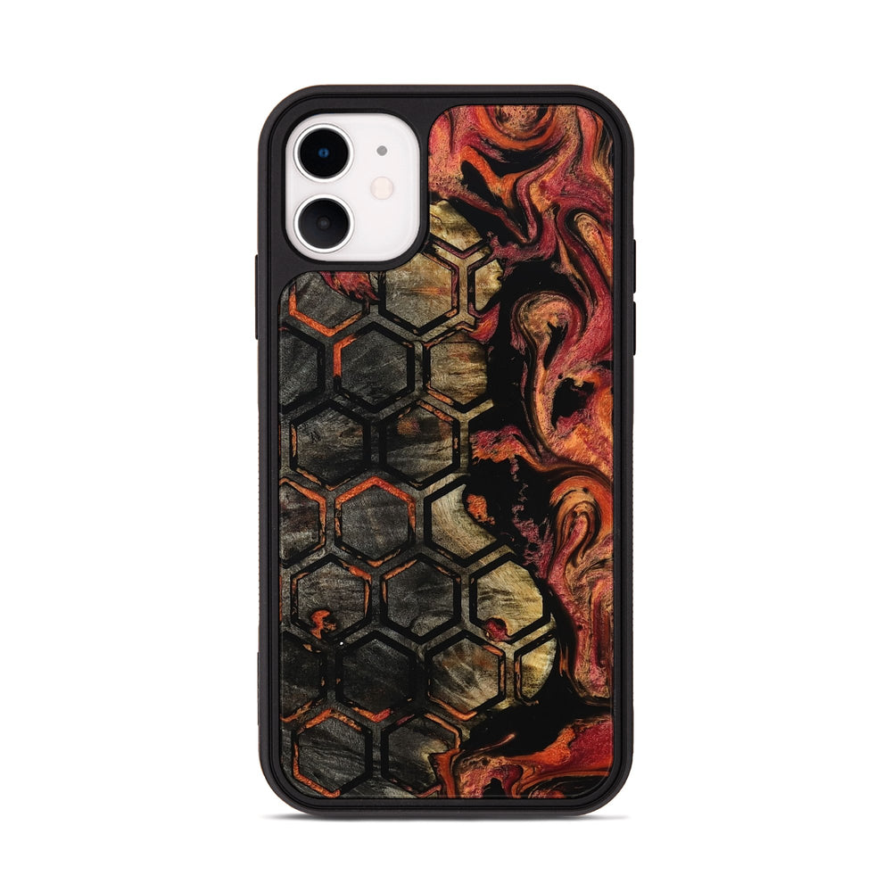 Aaden has warm tones of red and gold flowing around a pattern of hexagons. Its unique design blends natural wood with dynamic colors for an eye-catching look.