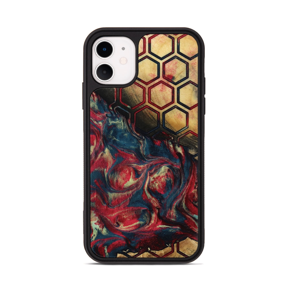 Chante has a beautiful mix of deep reds, blues, and golds swirling together. It features a striking honeycomb pattern that adds a unique touch to the natural wood.