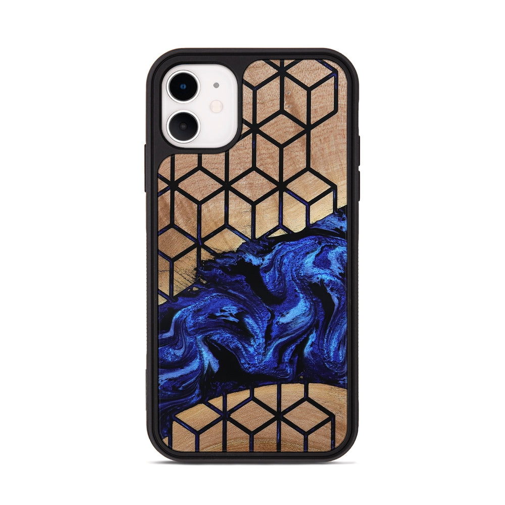 Tucker has a warm, natural look with smooth maple wood that showcases its rich grain. It features a geometric pattern of black cubes layered over swirls of deep blue, creating a striking contrast.