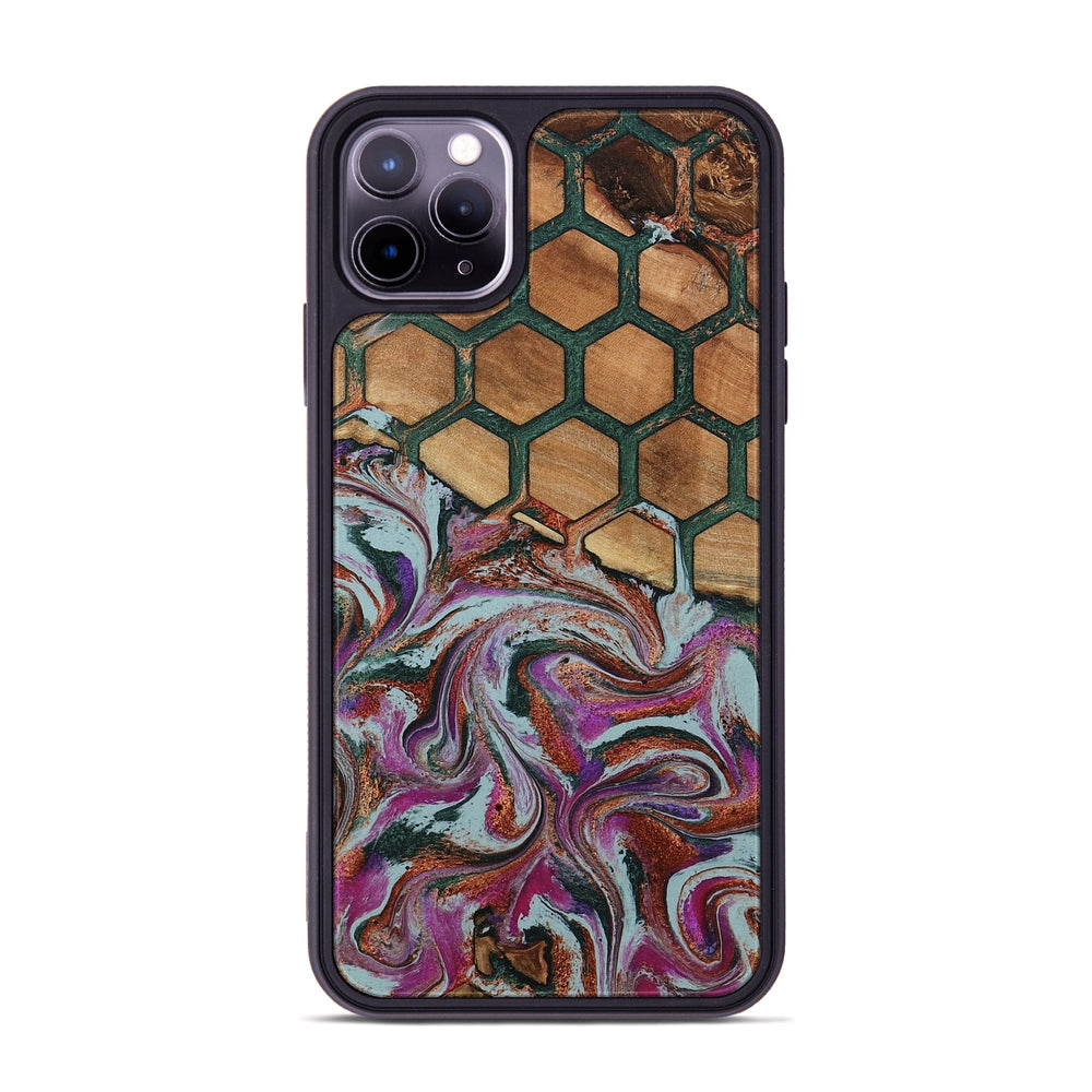 Fallon features a rich Maple wood with a warm, natural tone. Its design showcases a striking honeycomb pattern, beautifully contrasting with swirls of vibrant colors below.