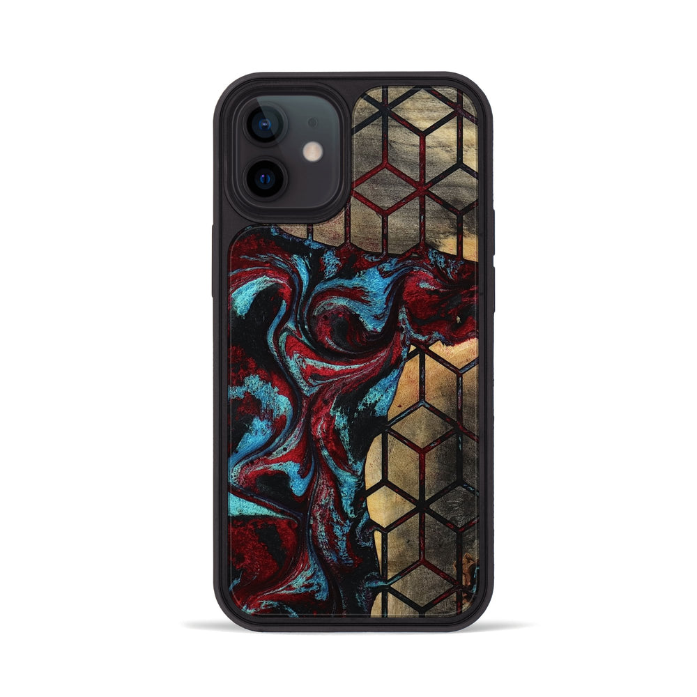 Casimer has a striking blend of deep reds and blues swirling against a backdrop of warm wood tones. The pattern of hexagons adds a playful touch, enhancing its unique visual appeal.