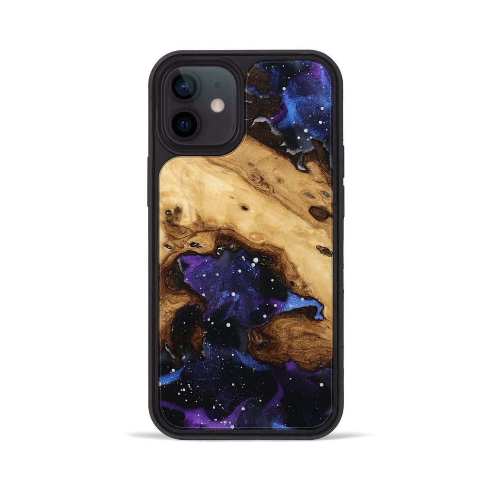 Isiah has a warm, natural wood grain with dark, swirled patterns that create a cosmic feel. The deep blues and purples in the background enhance its unique design, making it visually striking.