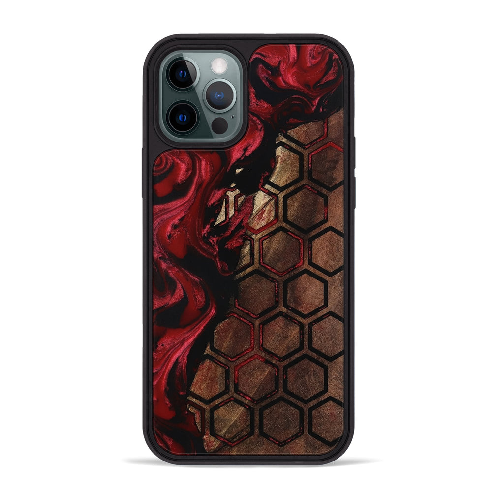 Carlie has a warm, rich Maple wood tone that highlights its natural beauty. It features a striking pattern of hexagons along one side, adding an interesting contrast to the flowing red details.