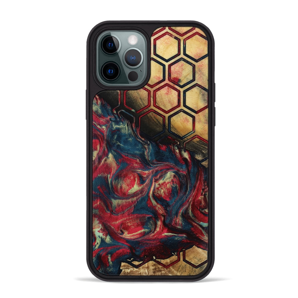 Chante has a beautiful mix of deep reds, blues, and golds swirling together. It features a striking honeycomb pattern that adds a unique touch to the natural wood.