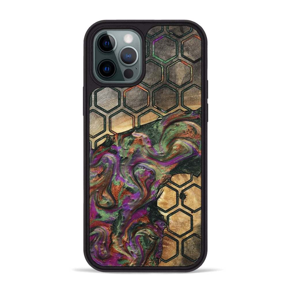 Jaelyn has a rich, colorful swirl pattern that blends vibrant greens, purples, and golds. The background features a striking honeycomb design that adds a unique texture to the piece.