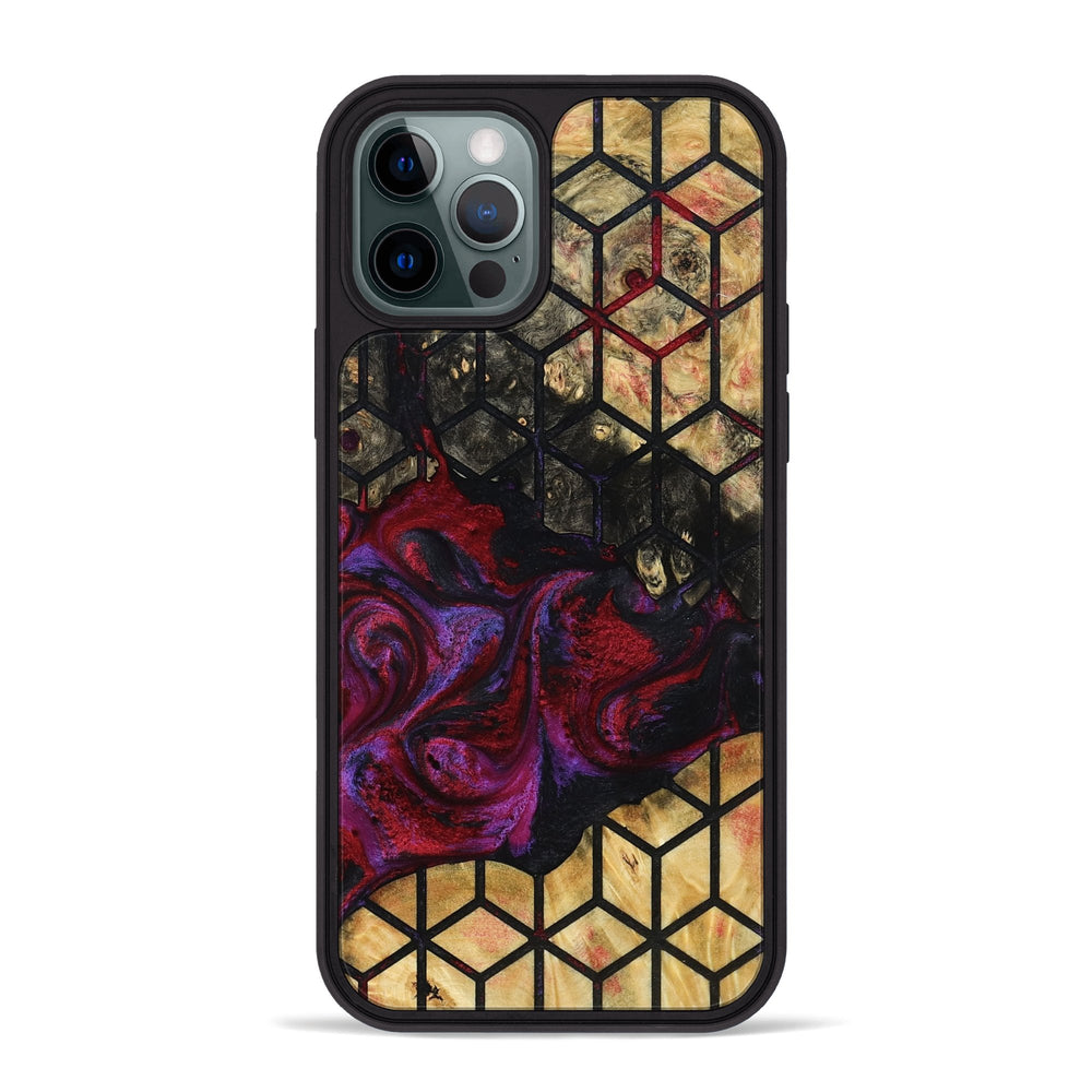 Mike has a warm, golden wood surface with dark patterns that create a striking hexagonal design. Swirls of deep red and purple add a pop of color and depth to the overall look.
