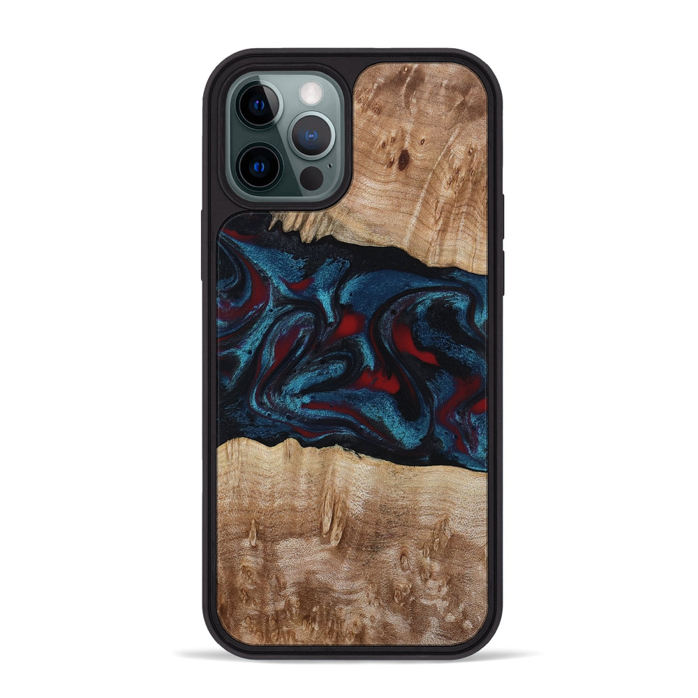 Rhea has a warm, natural Maple wood surface with soft swirls and a smooth finish. It features a striking contrast of deep blue and red patterns that create a lively flow across the wood grain.