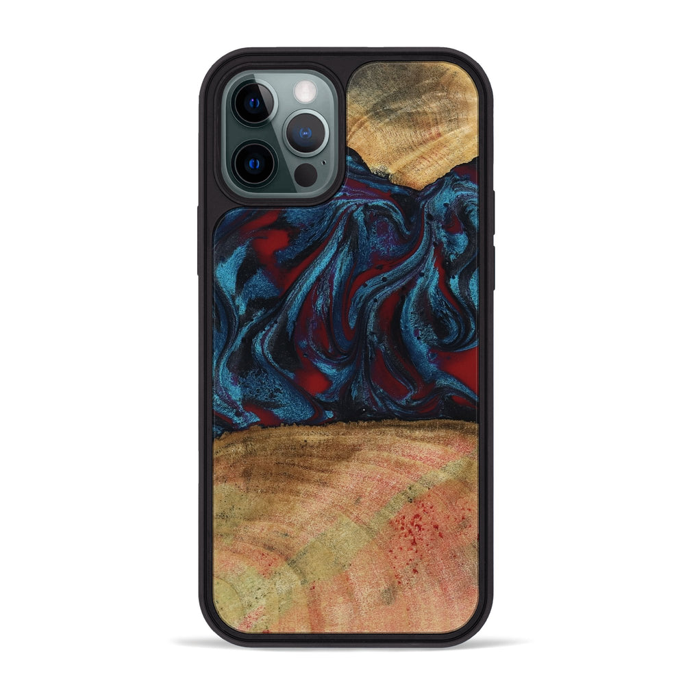 Trena has a rich blend of blue and deep red swirling patterns, creating a dynamic look. The warm tones of the Buckeye wood add a beautiful contrast to the vibrant colors.