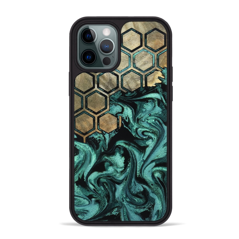 Zariyah features a mix of deep, swirling greens and blacks, creating a calming, fluid effect. It has a pattern of hexagons that adds a unique geometric touch to the natural wood design.