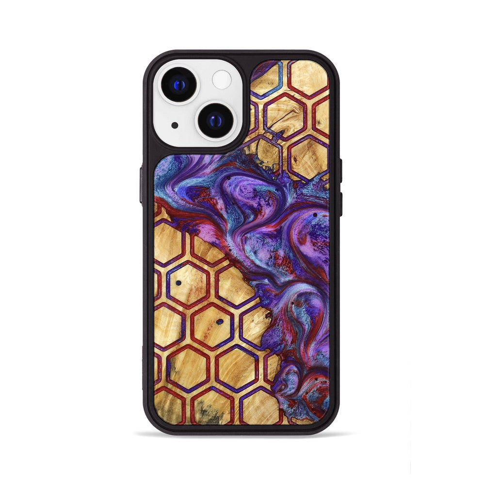 Yasmeen features a beautiful mix of swirling purple and blue patterns against a warm wood background. It showcases a honeycomb pattern that adds a unique texture and design element.