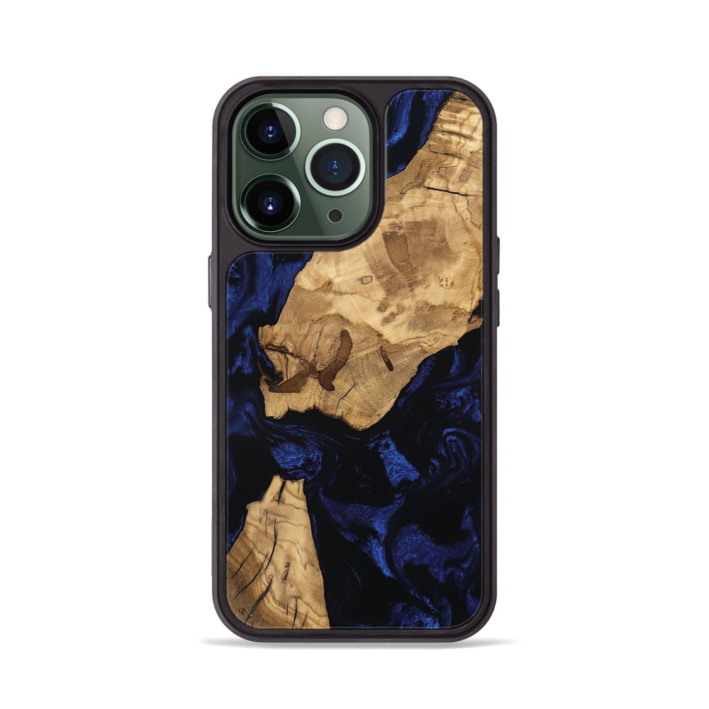 Issac features beautiful olive wood with warm golden tones and interesting grain patterns. The deep blue background swirls around the wood, creating a striking contrast that draws the eye.