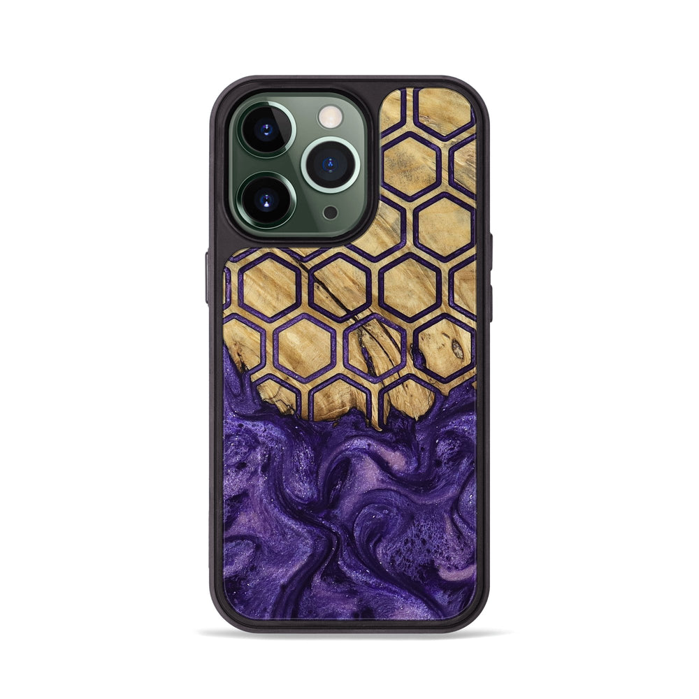 Regan has a unique pattern with honeycomb shapes arranged over a warm, golden wood background. The deep purple swirls at the bottom add a striking contrast, creating a balanced yet intriguing look.