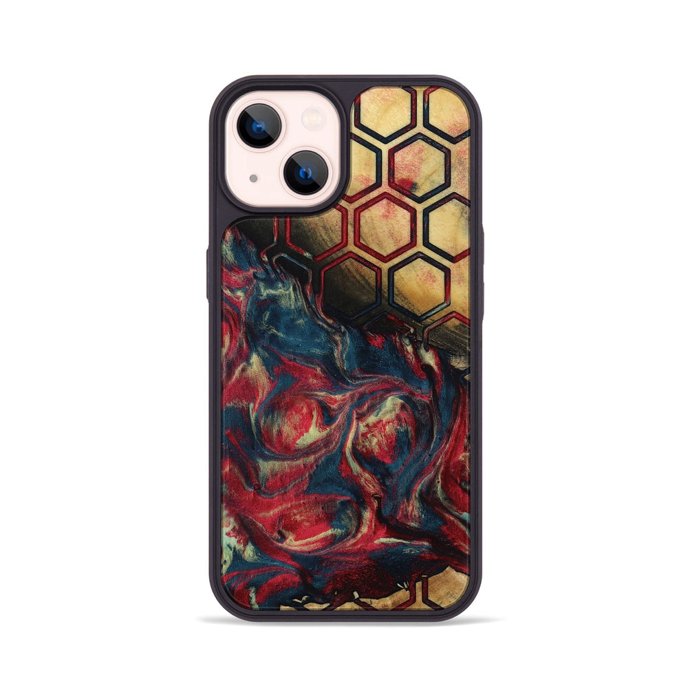 Chante has a beautiful mix of deep reds, blues, and golds swirling together. It features a striking honeycomb pattern that adds a unique touch to the natural wood.
