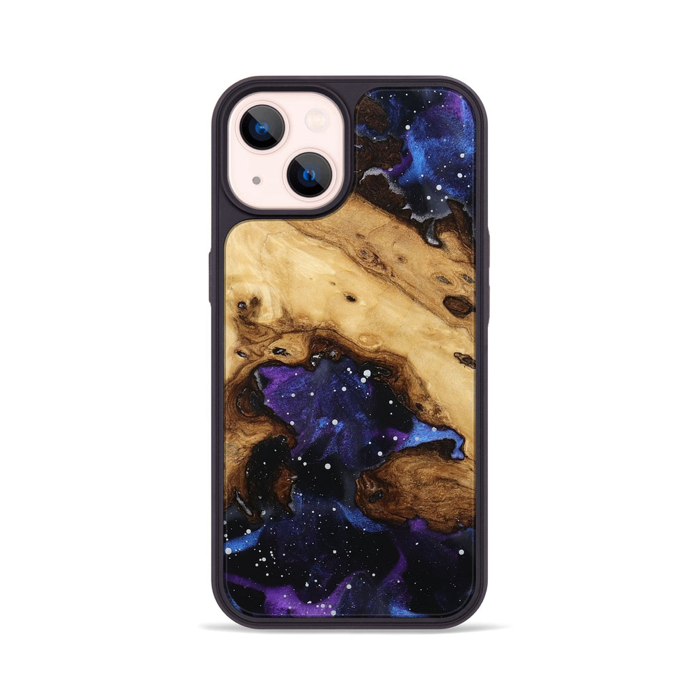 Isiah has a warm, natural wood grain with dark, swirled patterns that create a cosmic feel. The deep blues and purples in the background enhance its unique design, making it visually striking.