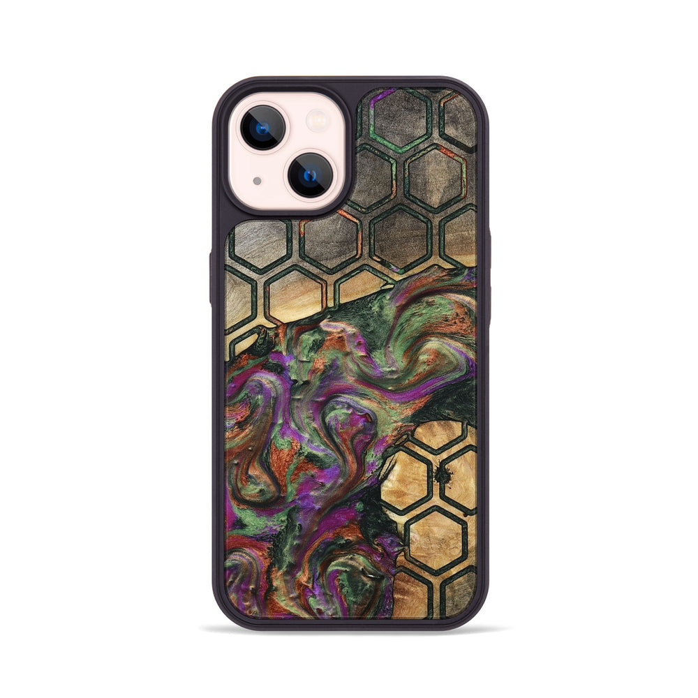 Jaelyn has a rich, colorful swirl pattern that blends vibrant greens, purples, and golds. The background features a striking honeycomb design that adds a unique texture to the piece.