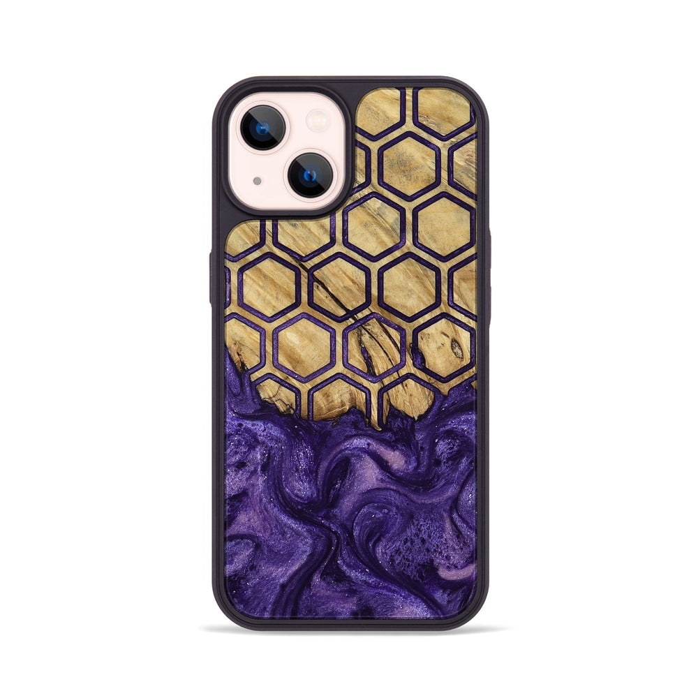 Regan has a unique pattern with honeycomb shapes arranged over a warm, golden wood background. The deep purple swirls at the bottom add a striking contrast, creating a balanced yet intriguing look.