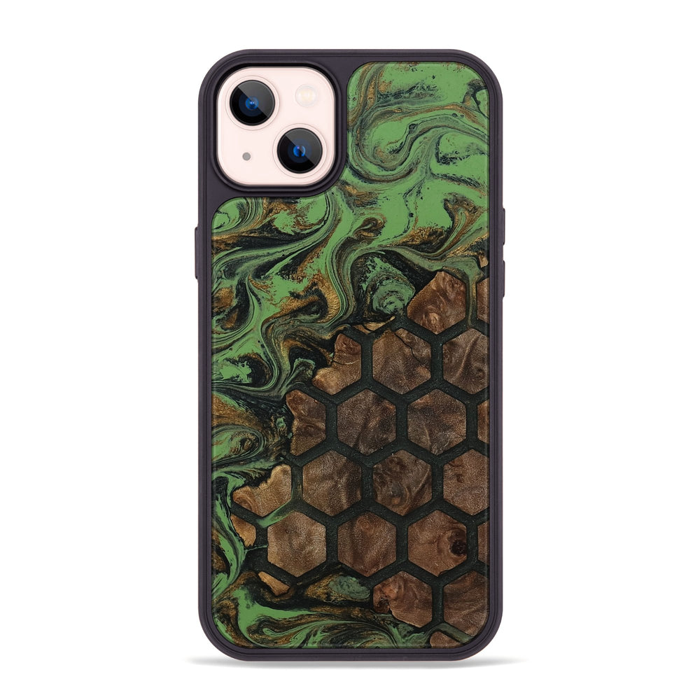 Aliza has a unique honeycomb pattern made from rich Maple wood, featuring warm, earthy tones. The vibrant green swirls in the background create a playful contrast with the natural wood.