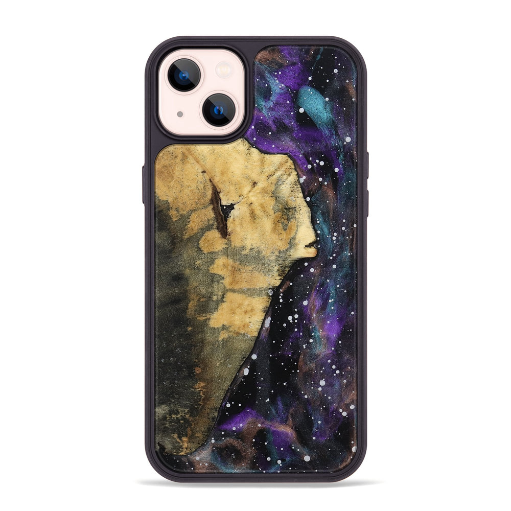 Callen has beautiful patterns that resemble swirling galaxies with deep purples and hints of blue. Its surface features natural wood grain that adds warmth and character, creating a striking contrast with the cosmic colors.