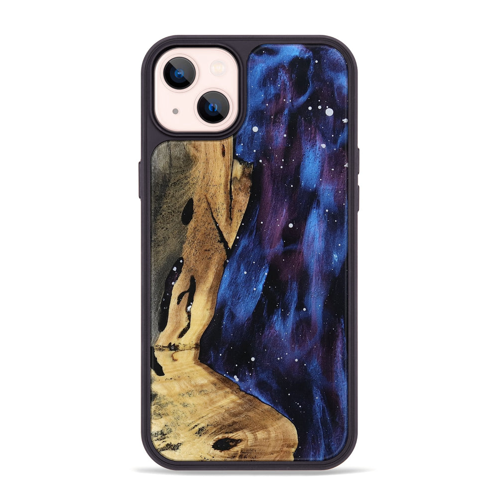 Mindi features a warm, natural wood grain that highlights its organic beauty. It has a striking contrast with deep blues and purples, creating a cosmic feel.