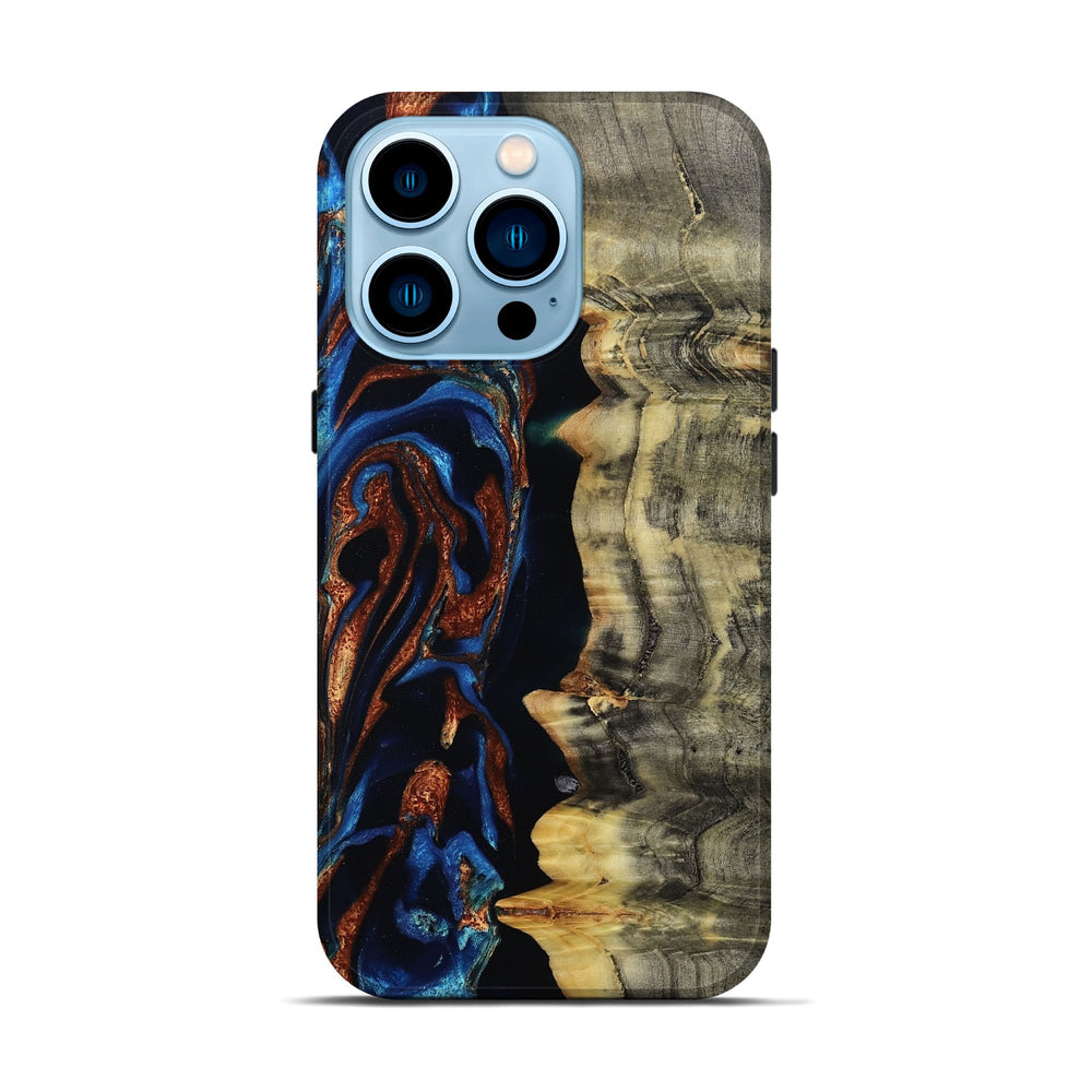 Our Live Edge cases are made from an amazing combination of stabilized wood burl and colored resin. Our stabilization process hardens the wood to protect against cracks and breaks. We do every step of the process at our shop in Northern Indiana. Perfectly fits the iPhone 14 Pro.