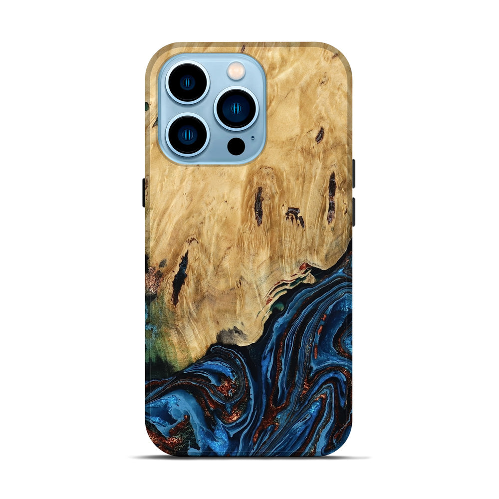 Our Live Edge cases are made from an amazing combination of stabilized wood burl and colored resin. Our stabilization process hardens the wood to protect against cracks and breaks. We do every step of the process at our shop in Northern Indiana. Perfectly fits the iPhone 14 Pro.