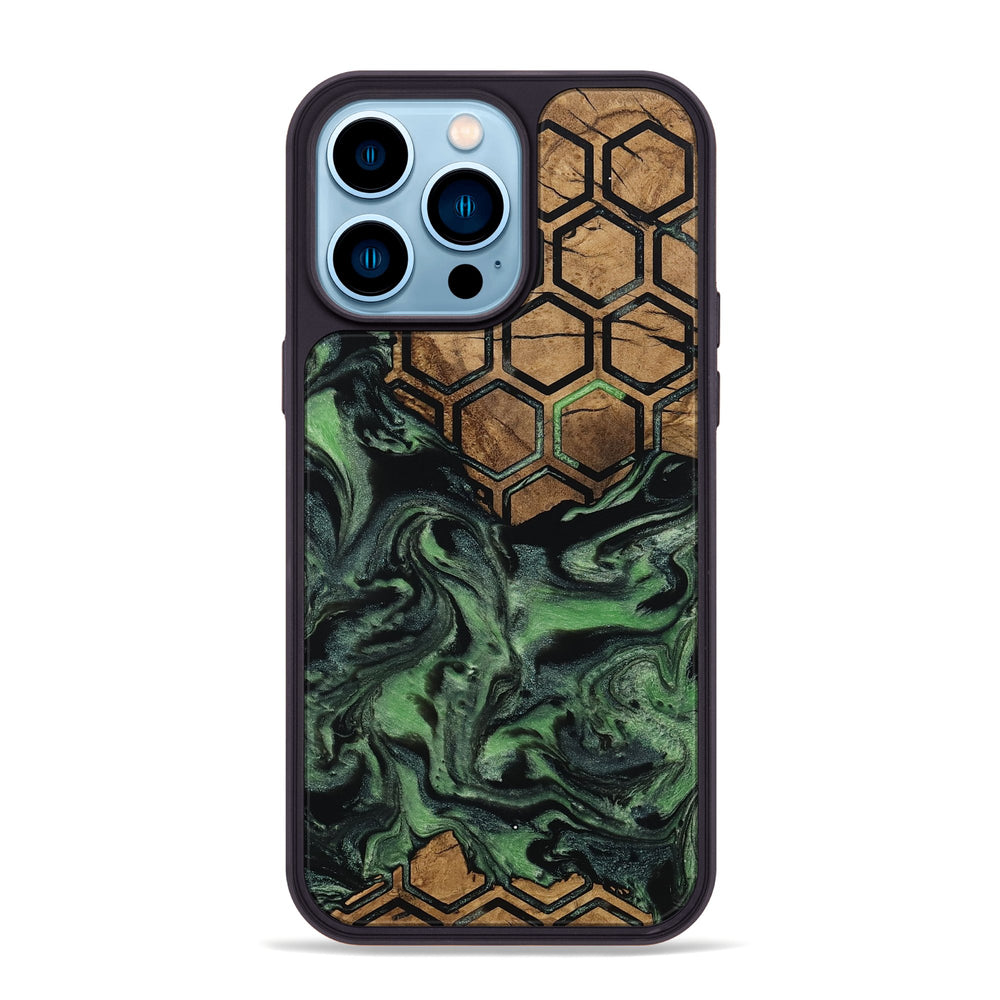 West has a rich Maple wood base featuring a warm, natural tone. It is beautifully paired with a striking hexagon pattern that contrasts with the smooth swirls of green and black.