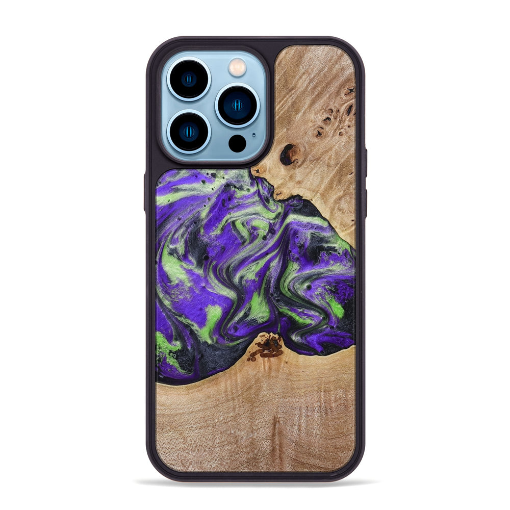Alpha has a smooth Maple wood surface with a natural grain. It features vibrant swirls of purple and green, creating a dynamic and eye-catching pattern.