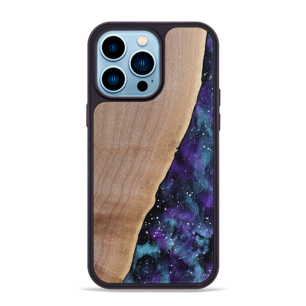 Aryan features smooth Maple wood with gentle curves and a light, warm hue. Its surface contrasts beautifully with a dark, swirling background of purple and blue, creating a stunning visual flow.