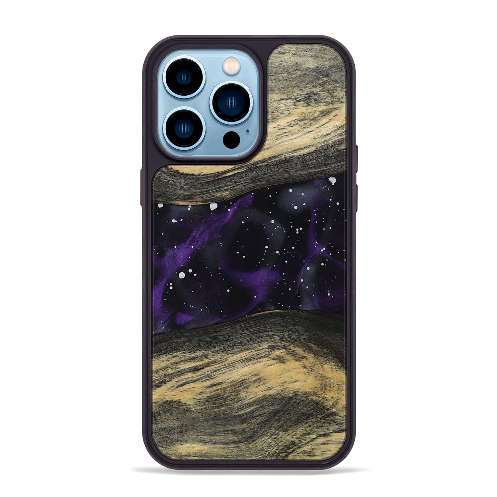 Brielle has beautiful Buckeye wood with gentle waves and a rich, dark grain. It features a striking design that resembles a cosmic scene with purple and white hues.