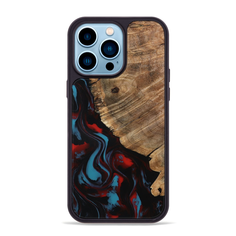 Kassie has a warm, natural finish of Maple wood with beautiful grain patterns. It features a striking mix of dark reds and blues swirling around it, adding a vibrant touch.