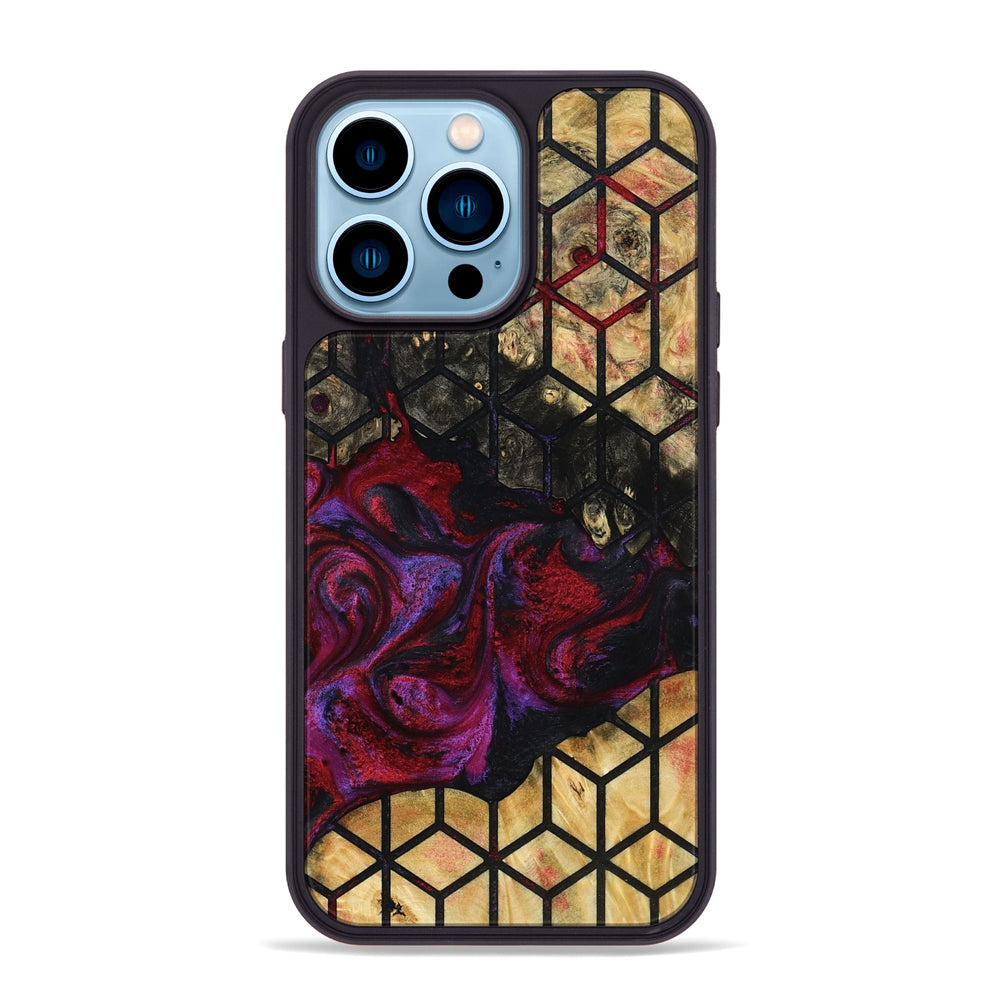 Mike has a warm, golden wood surface with dark patterns that create a striking hexagonal design. Swirls of deep red and purple add a pop of color and depth to the overall look.