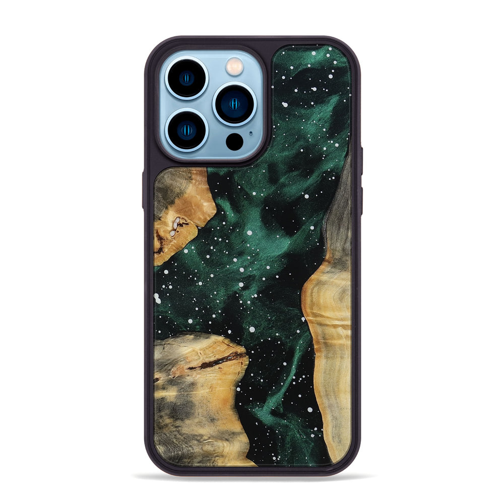 Miles has a striking pattern of deep greens and blacks, resembling a night sky filled with stars. The warm tones of the Buckeye wood frame the vibrant colors, creating a beautiful contrast.