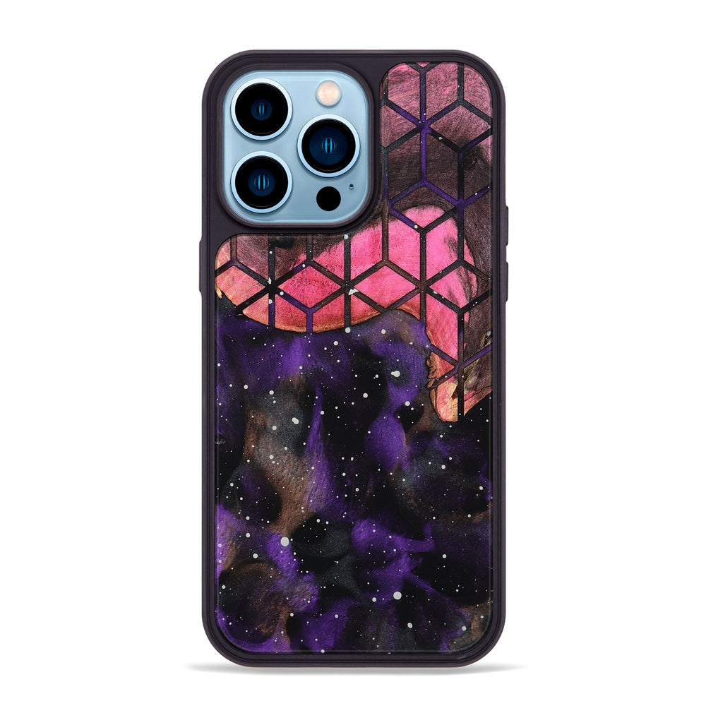 Pete is a vibrant piece of dyed wood featuring a mix of deep purples and pinks. It has a honeycomb pattern overlay that adds an interesting texture to its cosmic design.