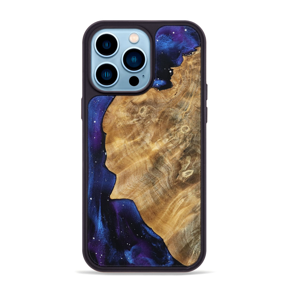 Selina has smooth, warm buckeye wood with beautiful grain patterns. The background features a deep, swirling mix of purple and blue, giving it a cosmic feel.
